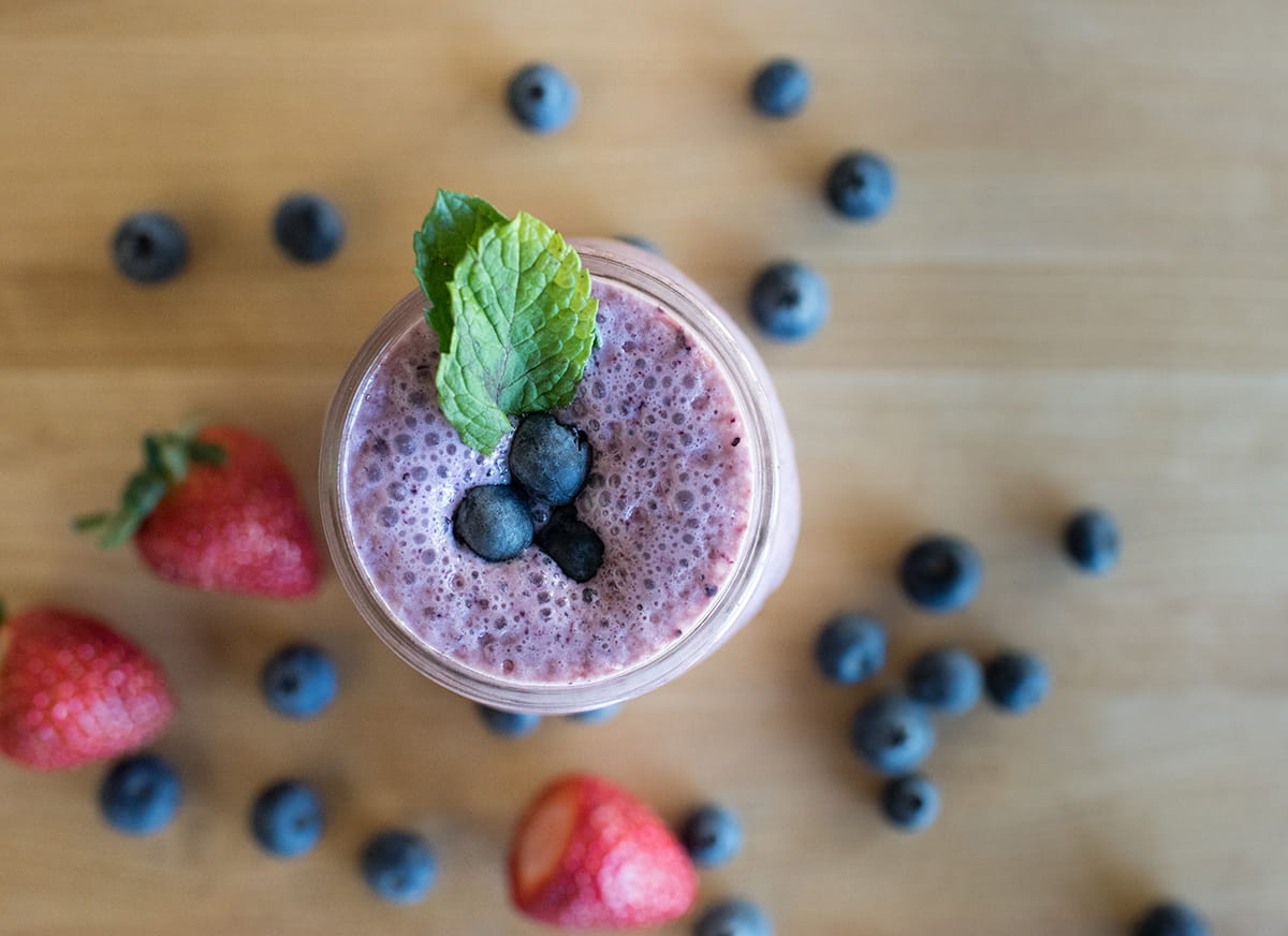 Add all ingredients to a blender. Process until the mixture is completely smooth. If the smoothie is too thick, add additional milk. Pour and serve immediately.