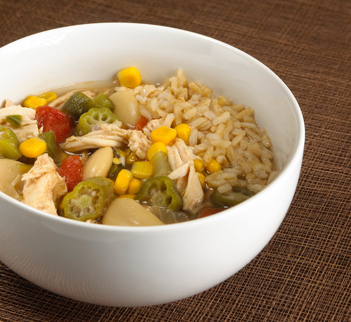 Put the broth, gumbo-mix vegetables, chicken, beans, corn, tomatoes with liquid, and seasoning blend in a large pot. -