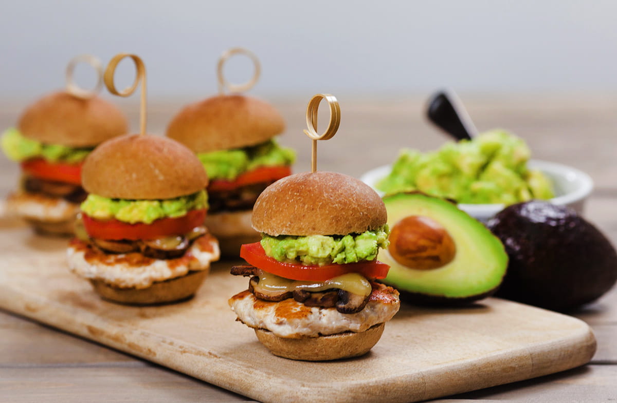 Spread the avocado over the Swiss cheese. Top with the tomato slices. Put the tops of the buns on the sliders. -